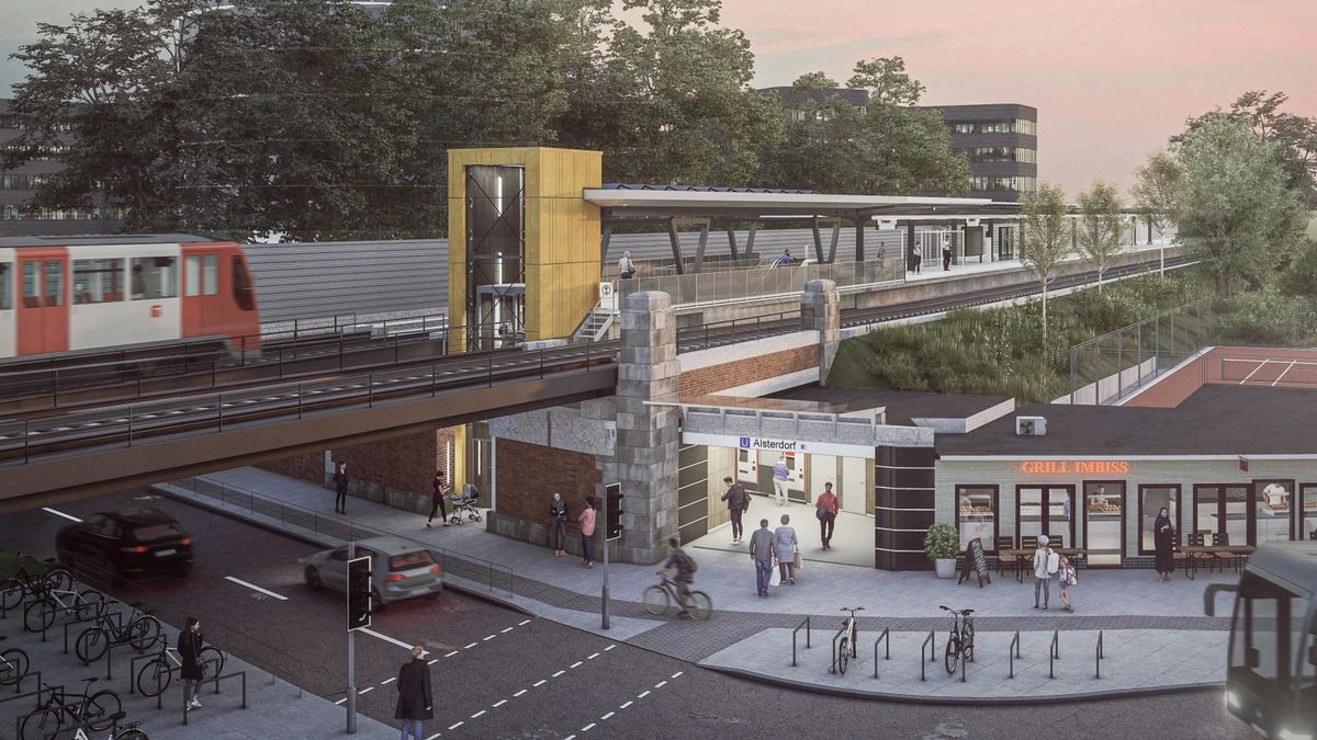 Hamburg-Alsterdorf je povrchová stanice metra, kde na původní historický přístřešek měla navázat moderní část zastřešení s podchodem a výtahovou šachtou. Předmětem námi dodané výrobní dokumentace byla ocelová konstrukce nové části střechy s výraznými trojúhelníkovými sloupy včetně opláštění, opláštění a markýzy výtahové šachty, skleněné zábradlí kolem výstupu z podchodu vč. statického a dynamického posudku, servisní zábradlí a schodiště pro personál.