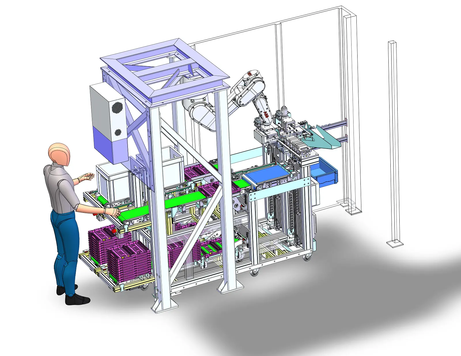 Zařízení pro automatický odběr a třídění výlisků z vstřikovacího lisu Demag 130 Intelect. Zařízení rozlišuje dva typy manipulace – zálisky jsou buď ukládány do blistrů na stohovatelný pásový dopravník, nebo volně do plastových beden. Klíčovým prvkem zařízení je tříosý manipulátor, který přenáší výlisky do překládací stanice, kde je přebírá robot ABB IRB 1300 s chapadlem uzpůsobeným pro různé typy zálisků. V případě blistrování dochází v překládací stanici ke změně rozteče dílů podle formátu blistru. Výlisky určené k volnému uložení do beden se ukládají bez změny rozteče. Součástí dodávky byl kompletní vývoj včetně konstrukce, výroby, instalace řídicího systému a robotu ABB, i následného školení obsluhy.