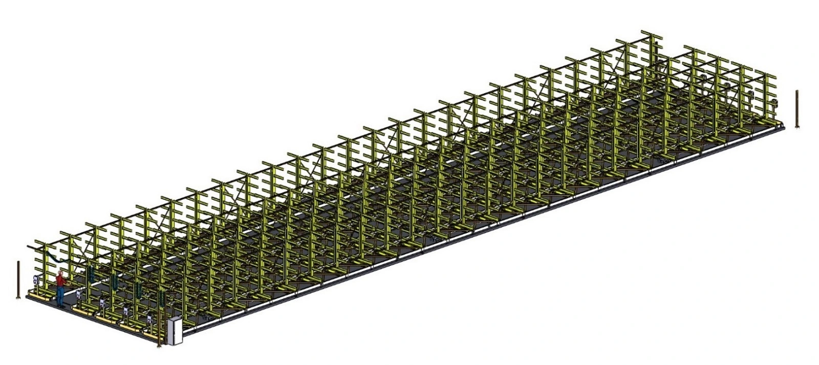 V rámci studie jsme navrhli řešení pro zvýšení kapacity skladování trubek v prostoru mezi regály. Cílem bylo efektivně využít prostor a zlepšit manipulaci s materiálem.