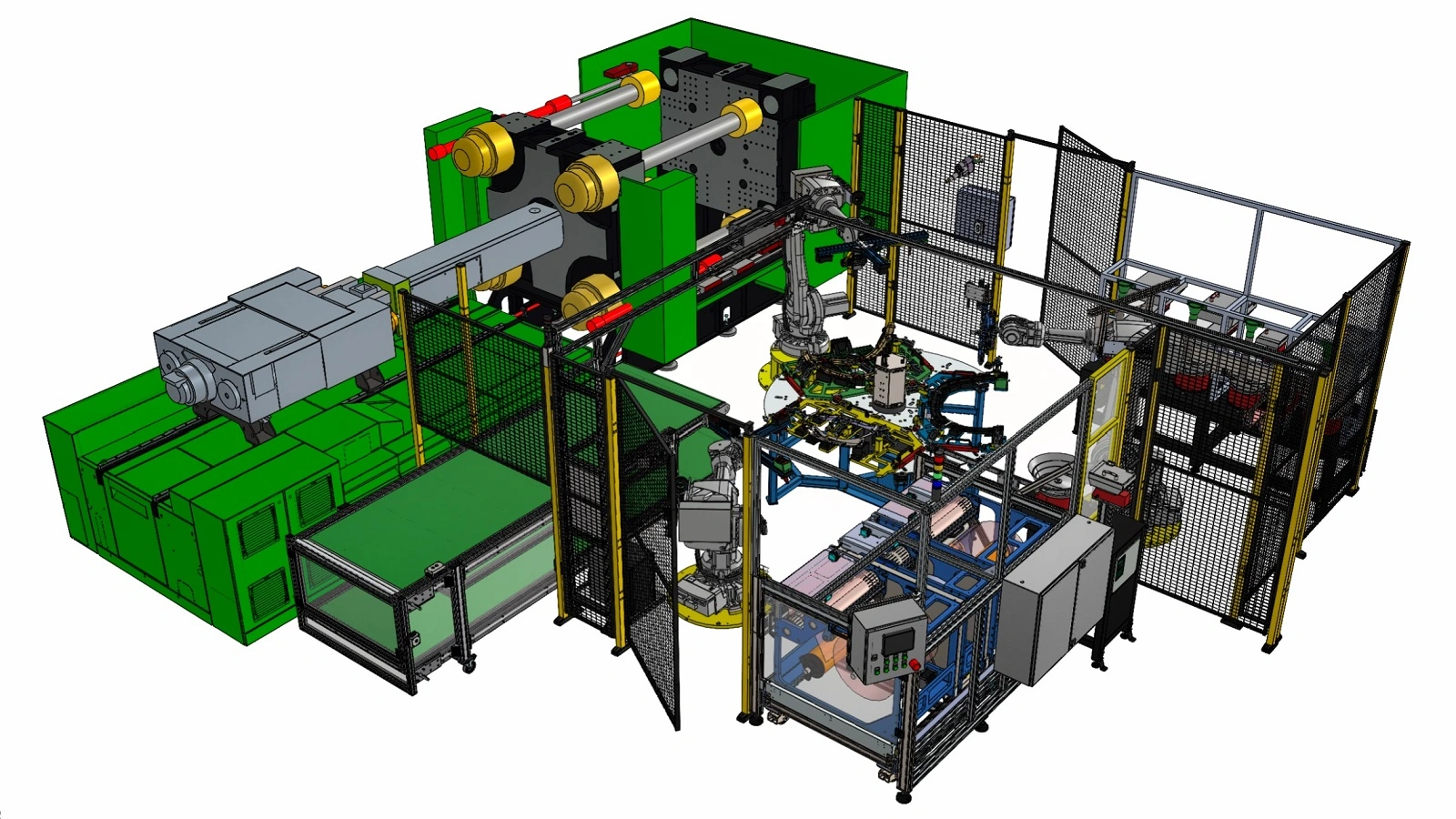 Automatizované robotické pracoviště pro kompletaci plastových sestav blatníků pro automobilový průmysl. Zařízení je navrženo s ručním zakládáním vstupního materiálu a slouží jako příslušenství k vstřikovacímu lisu ENGEL. Tři robotické jednotky ABB zajišťují veškeré následné operace — od vyjmutí dílců z lisu přes plazmování, osazování komponent, lepení páskou až po kamerovou kontrolu a laserové značení. Pracoviště je kompletně oploceno a zajištěno proti nechtěnému zásahu do automatizovaného procesu.