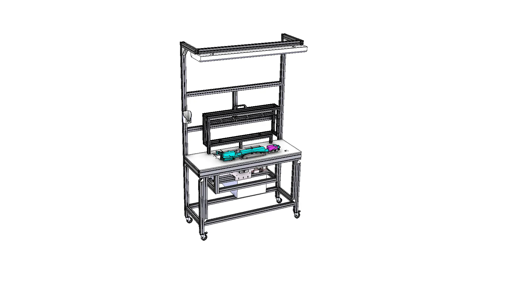 Nosná konstrukce je vyrobena z hliníkových profilů, což zajišťuje lehkost a odolnost zařízení. Konstrukce je mobilní, osazená kolečky pro snadný přesun stanice v pracovním prostoru. Dvě otočná kolečka jsou vybavena aretací, která umožňuje stabilní ustavení stanice při použití. - Pneumatické nůžky