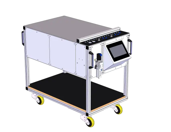 Pneumatický testovací vozík s dotykovým displejem a PLC jednotkou je mobilní zařízení navržené pro automatizované testování montážních sestav přímo ve výrobním provozu. Robustní konstrukce z hliníkových profilů spolu s průmyslovou výbavou pneumatických a elektronických prvků zajišťuje přesné, rychlé a opakovatelné testování. Díky dotykovému displeji, PLC řídicí jednotce a možnosti rozšíření o různé senzory a komunikační rozhraní je zařízení vhodné pro široké spektrum zkoušek a validací, včetně tlakových testů nebo kontroly funkčnosti. Vysoká mobilita, modularita a snadná obsluha dělají z tohoto vozíku efektivní nástroj pro zajištění kvality ve výrobě.