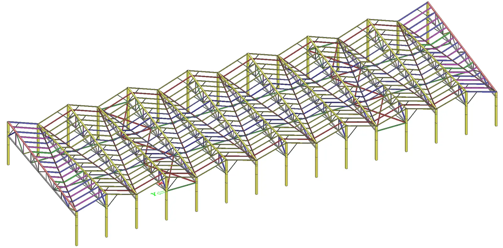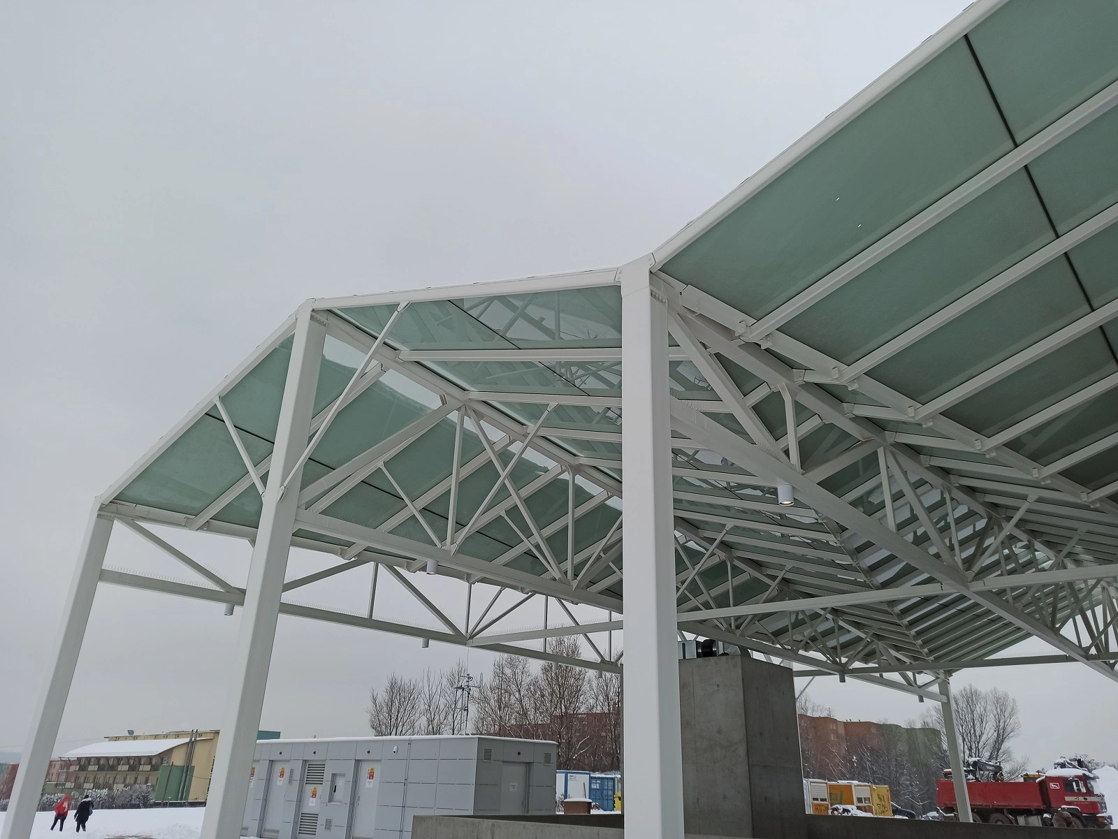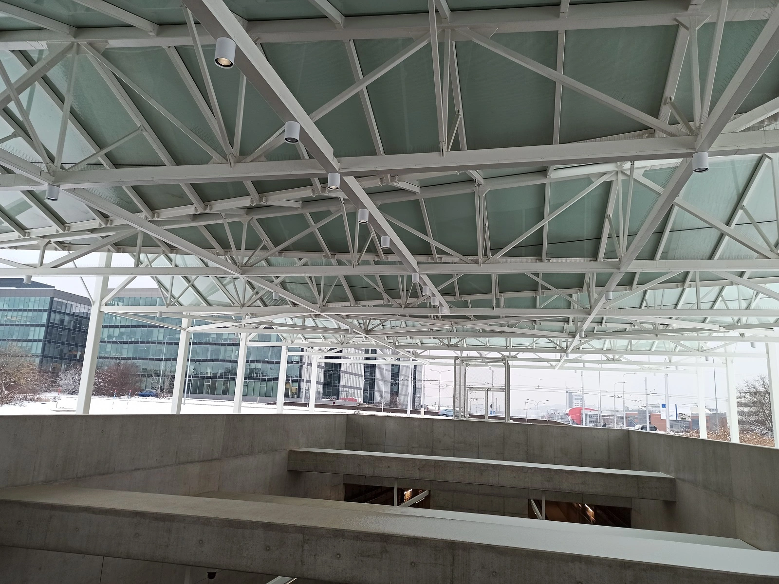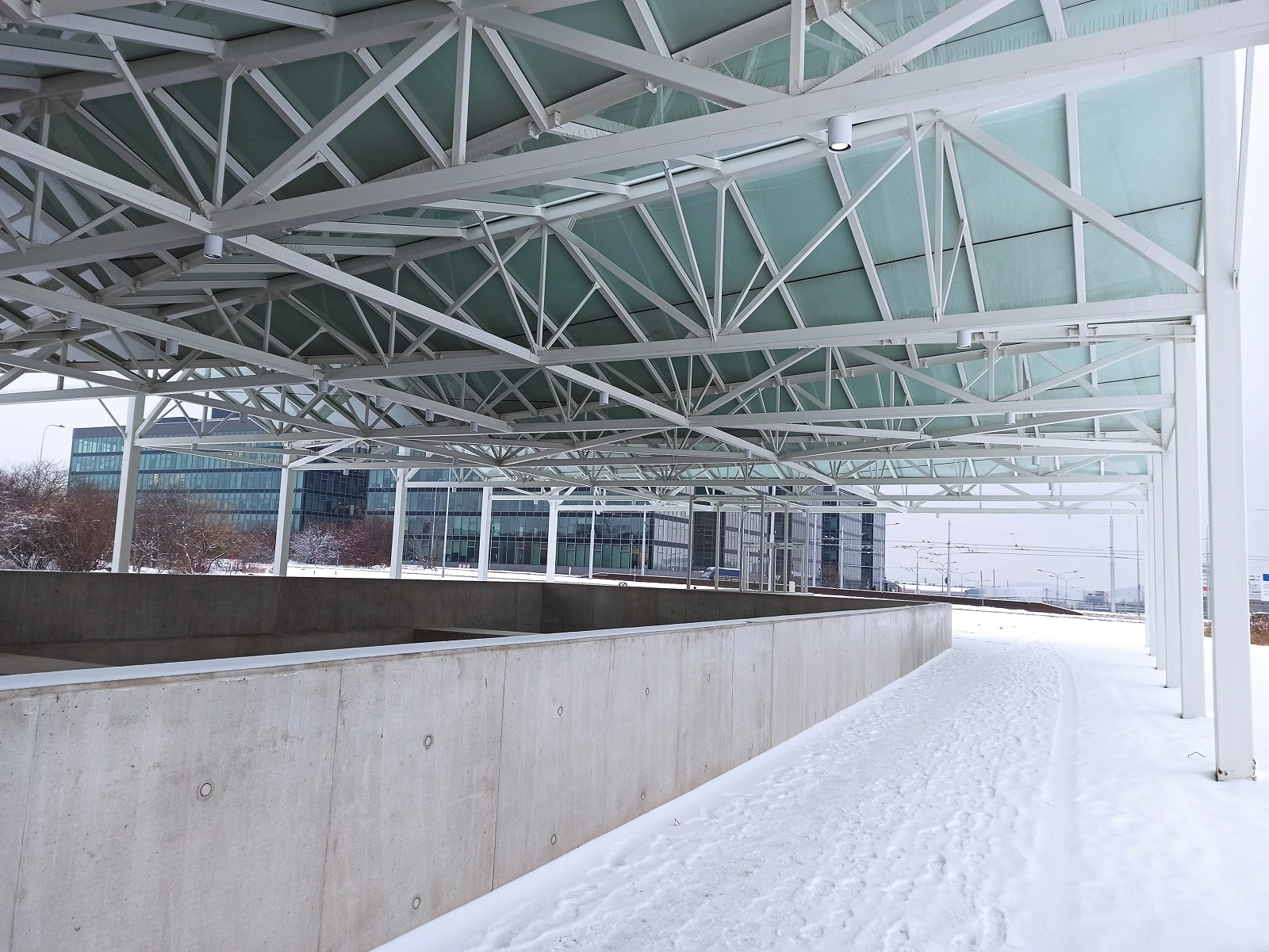 Všechny spoje proto byly projektovány jako skryté či minimalistické, a rovněž odvodnění střechy bylo navrženo skrytě dutinami sloupů. Konstrukce byla žárově zinkovaná i lakovaná. Délka, šířka a výška konstrukce jsou 77,0 x 25,6 x 8,7 m.